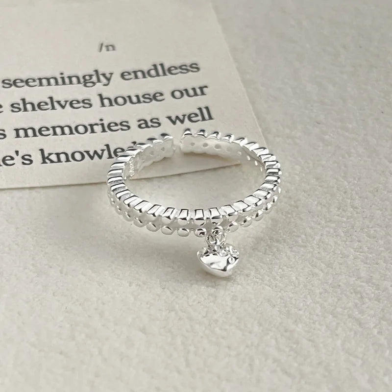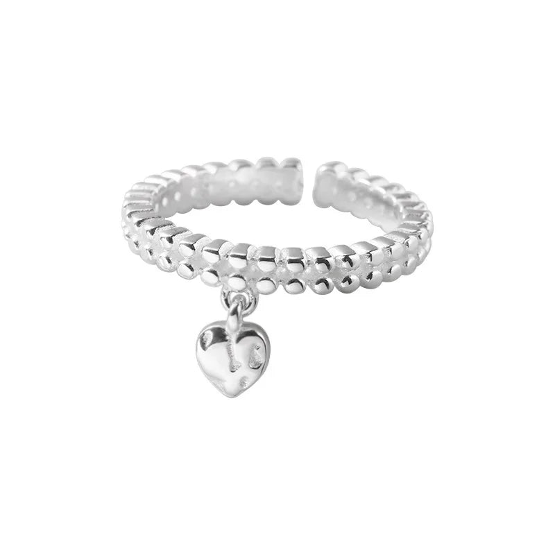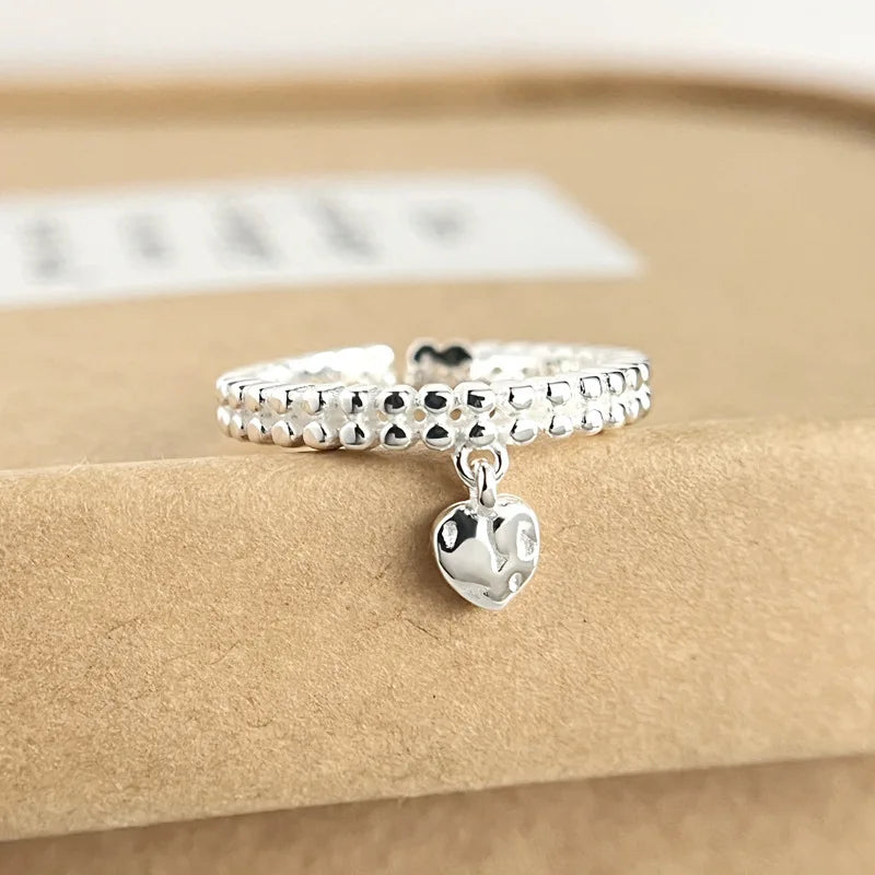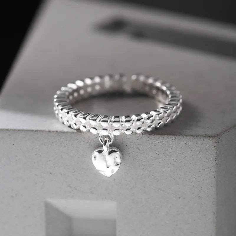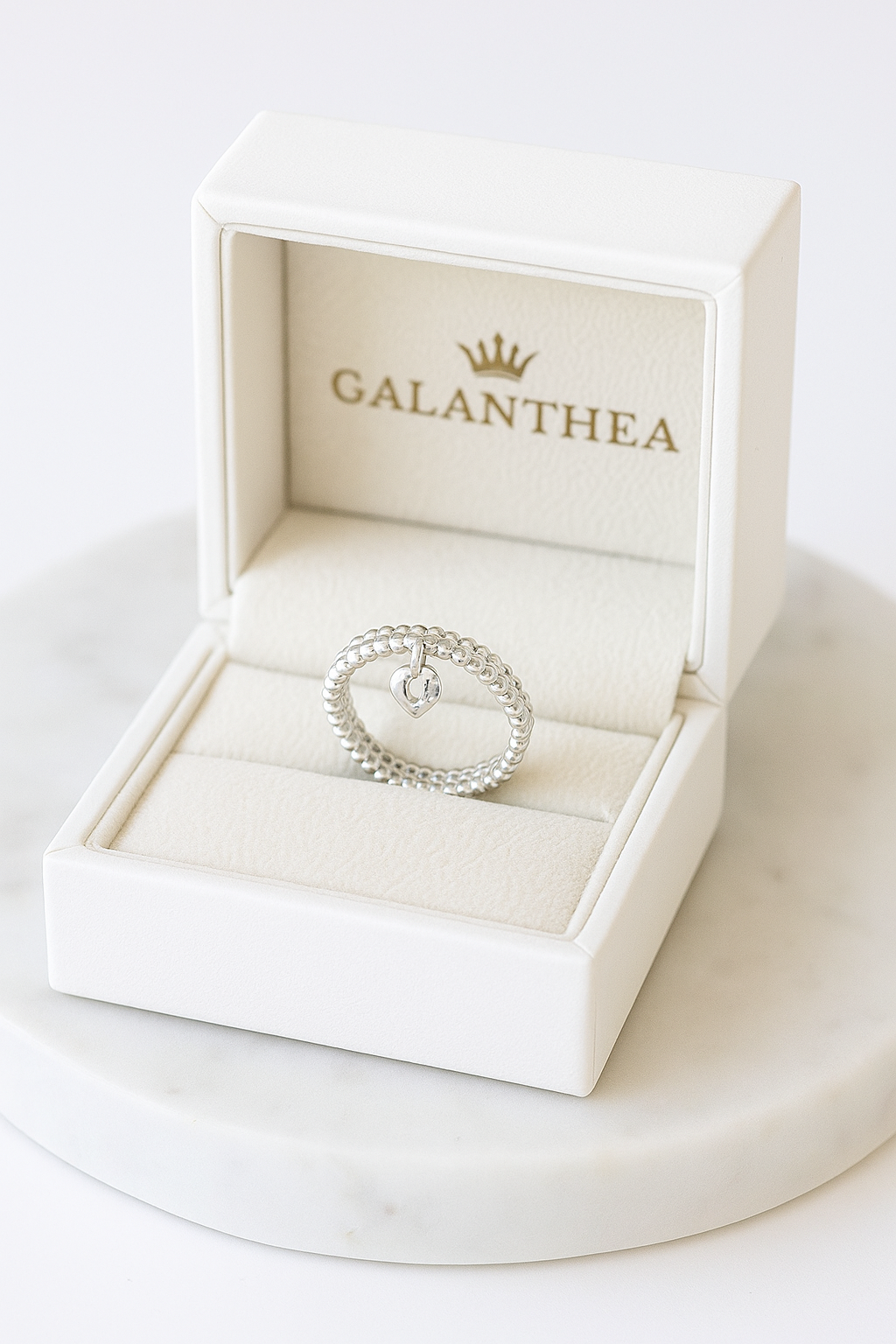The Dragon’s Heart Ring blends strength with tenderness. Its unique woven silver design is adorned with a delicate dangling heart, symbolizing passion, loyalty, and protection. A bold yet romantic piece, perfect for expressing individuality and love.